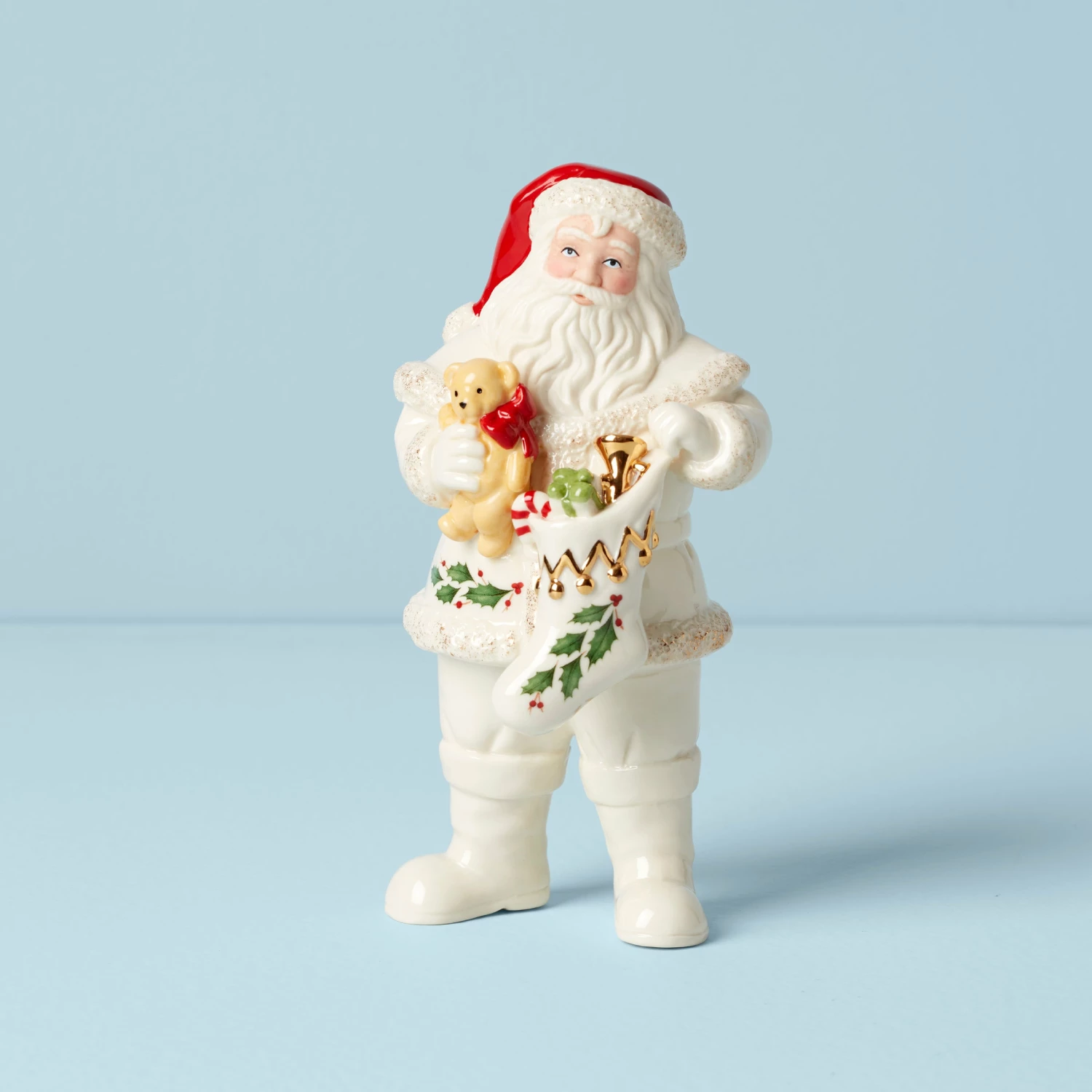Our darling and dazzling Santa figuring is here to help you deck the halls. He’s dressed from head to toe in winter white with holiday holly leaves and berries. He’s holding a stocking, dripping with gold accents and all the gifts he’d love to give you.