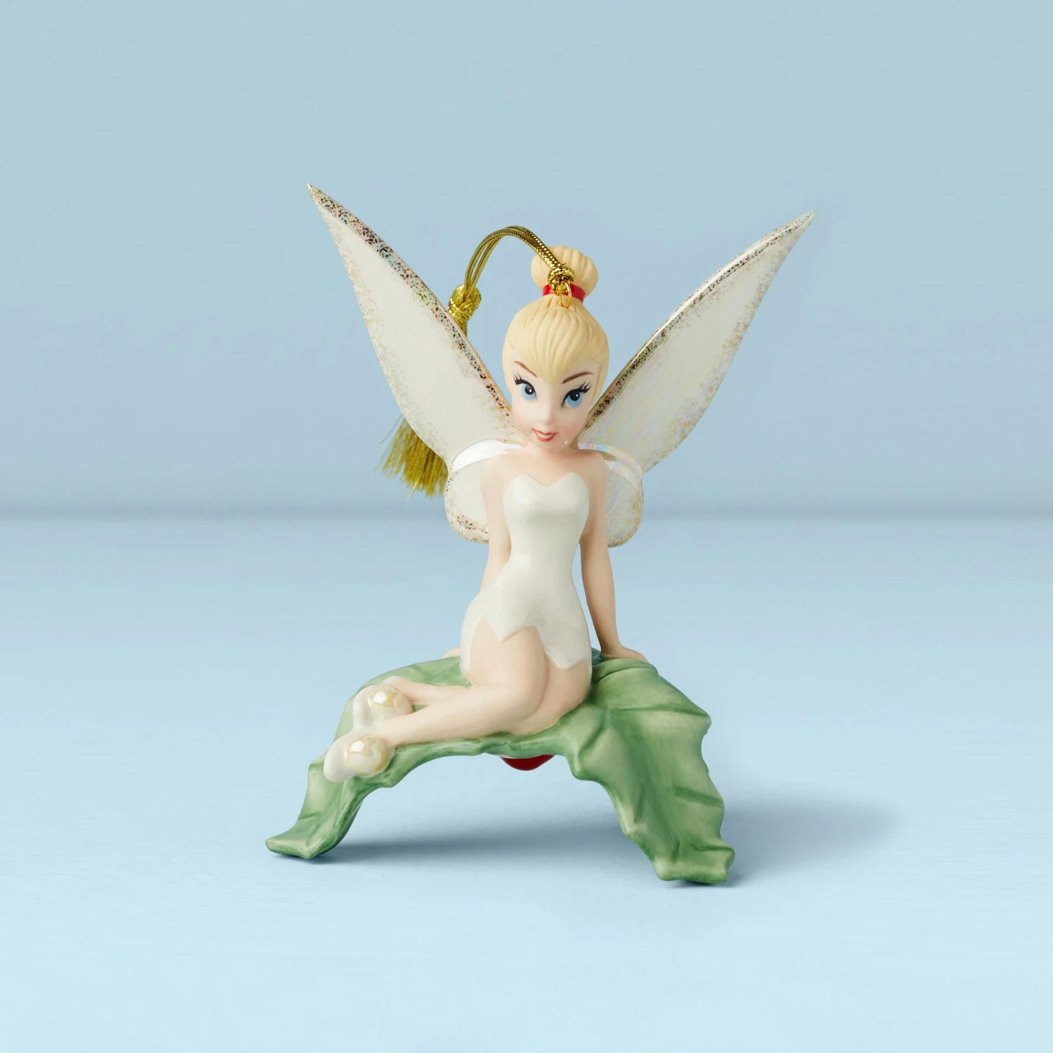 Tinker Bell is sitting pretty on this tiny, festive leaf. Her lush green perch makes an adorable addition to the scene she’s creating with her sparkling fairy wings t, gold-accented fairy wings.