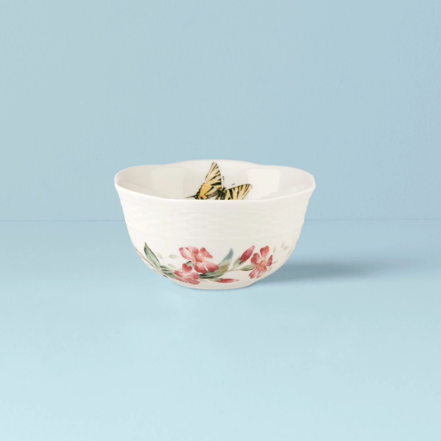 The delightful and modern Butterfly Meadow Basket Bowl features an exquisite nature motif of a butterfly fluttering above soft pink flowers. Crafted from durable ceramic porcelain, this bowl is dishwasher-safe for added convenience.