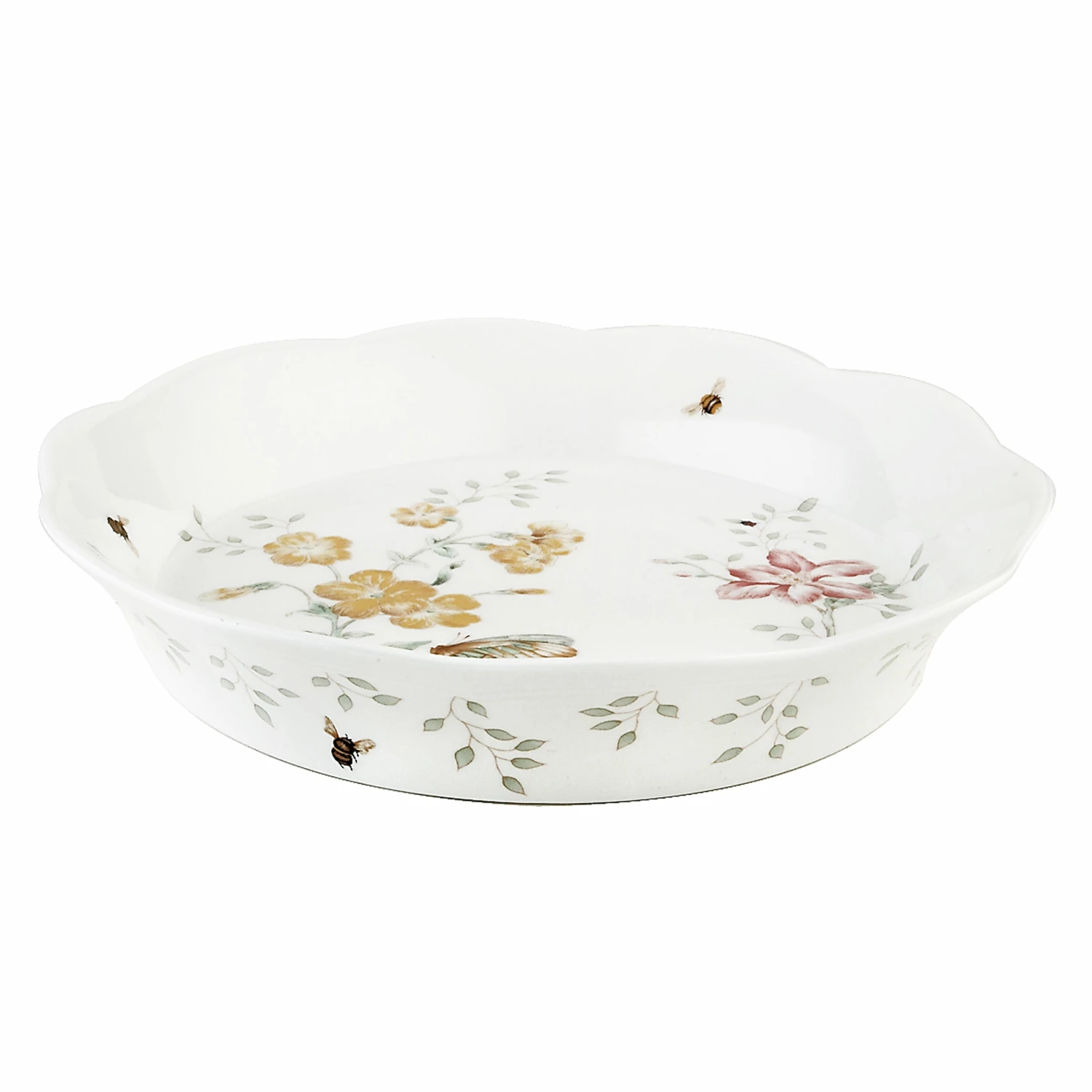 Whip up something delicious with this deep pie dish! Featuring our popular Butterfly Meadow motif of blossoming flowers and buzzing bees, this porcelain dish has a scalloped ruffle edge for a beautiful presentation for all your sweet creations.