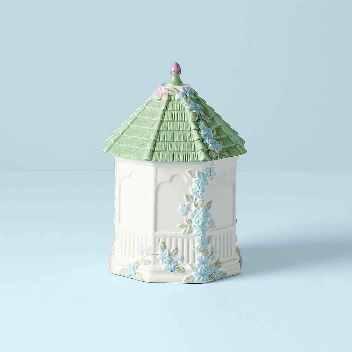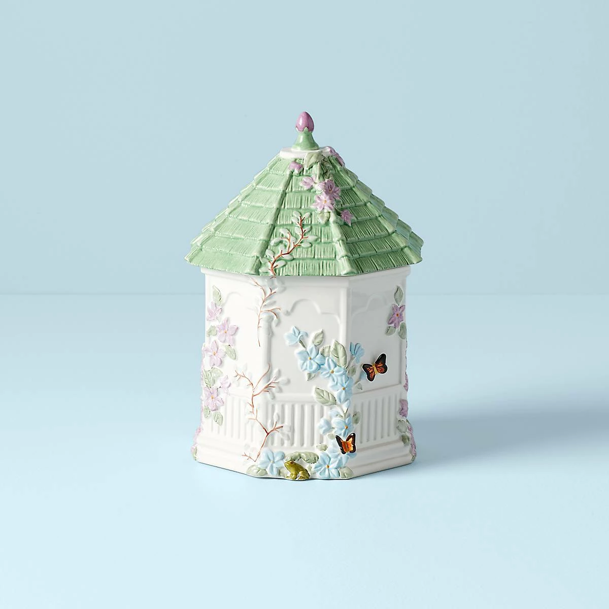 This durable white ceramic earthenware figural takes the shape of an aged gazebo surrounded by lively butterflies and flowering vines crawling across its surface. Part of the Butterfly Meadow Collection, the dishwasher-safe Gazebo Cookie Jar is ideal for storing snacks and makes a pleasant countertop accent.