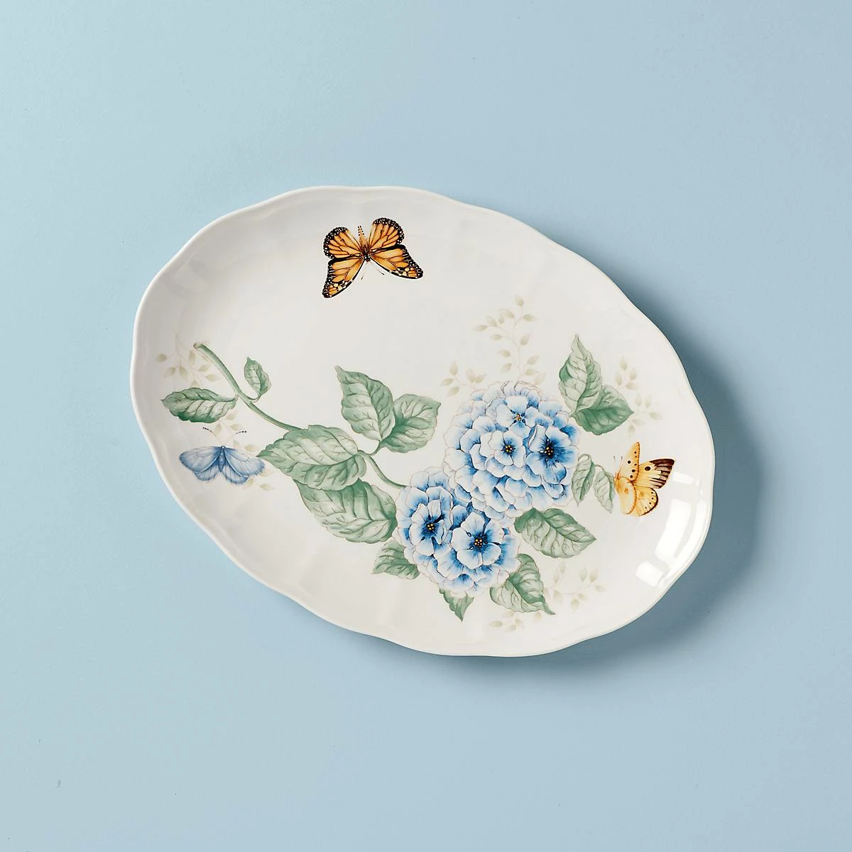 The yellow tigertail, golden monarch and sky-blue butterfly make an appearance on the durable white ceramic porcelain Butterfly Meadow Oval Serving Platter. This dishwasher and microwave-safe serving piece is a vibrant addition to any sideboard, buffet or dinnerware collection.