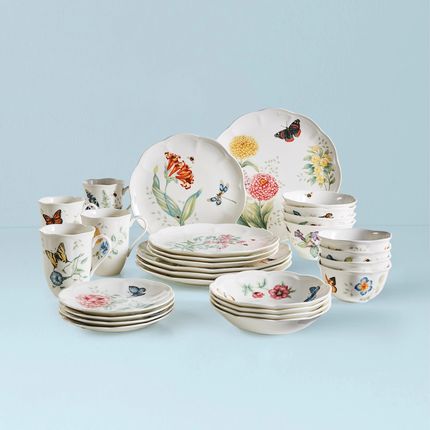 Lively butterflies, dragonflies, and bumblebees buzz about a variety of vibrant flowers on this 28-piece Butterfly Meadow dinnerware set. The trademark design features elegant scalloped edges on durable white porcelain. The bonus? Everything is both microwave and dishwasher safe. Pick up our best-selling set from our #1 Butterfly Meadow collection today!