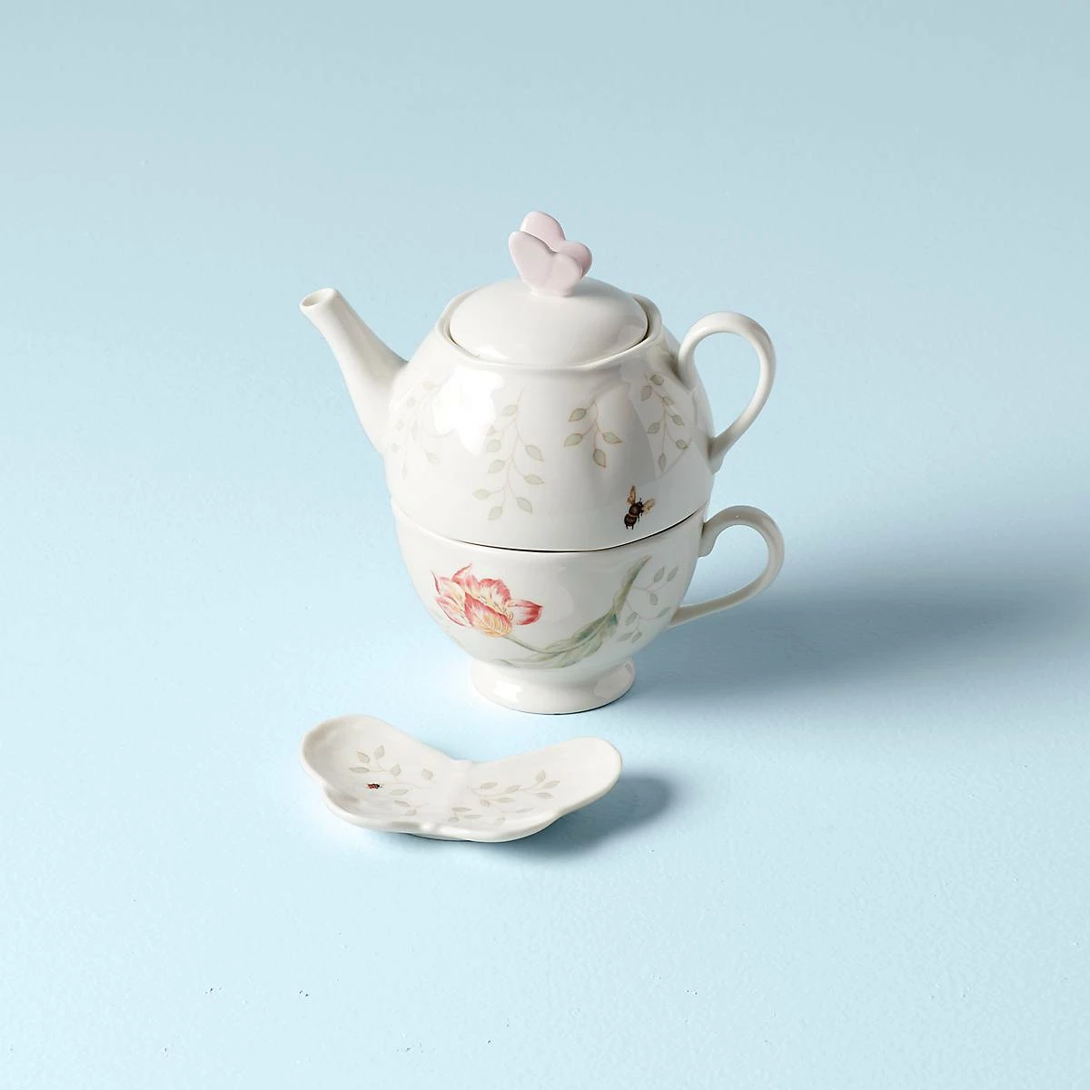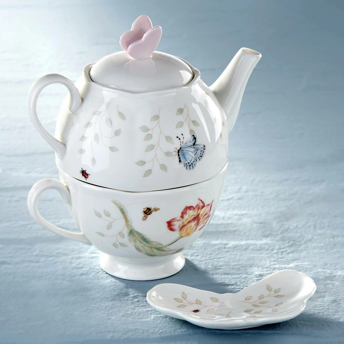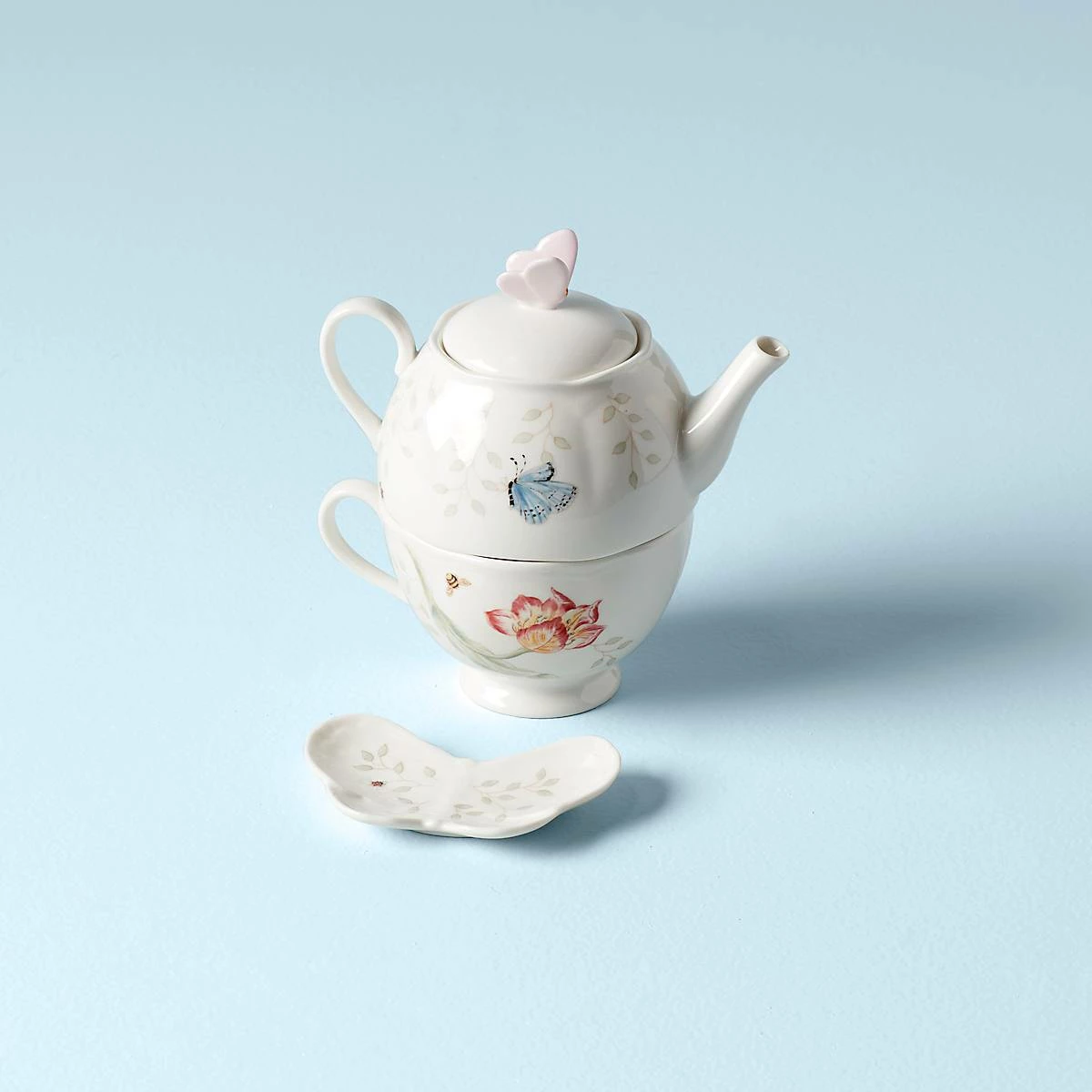 Anyone up for some tea? This charming 3-piece set comes in a clever stacked design with a teapot on top and a teacup below that makes it easy to store in your kitchen cabinets. A butterfly-shaped tea bag holder completes the set for a charming finish to the pretty theme. It’s crafted of beautiful white porcelain and finished in our iconic Butterfly Meadow floral pattern. Plus, everything is dishwasher and microwave safe!