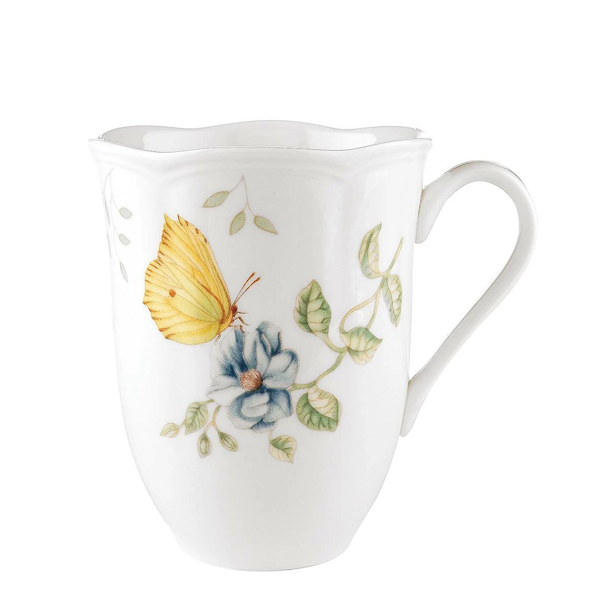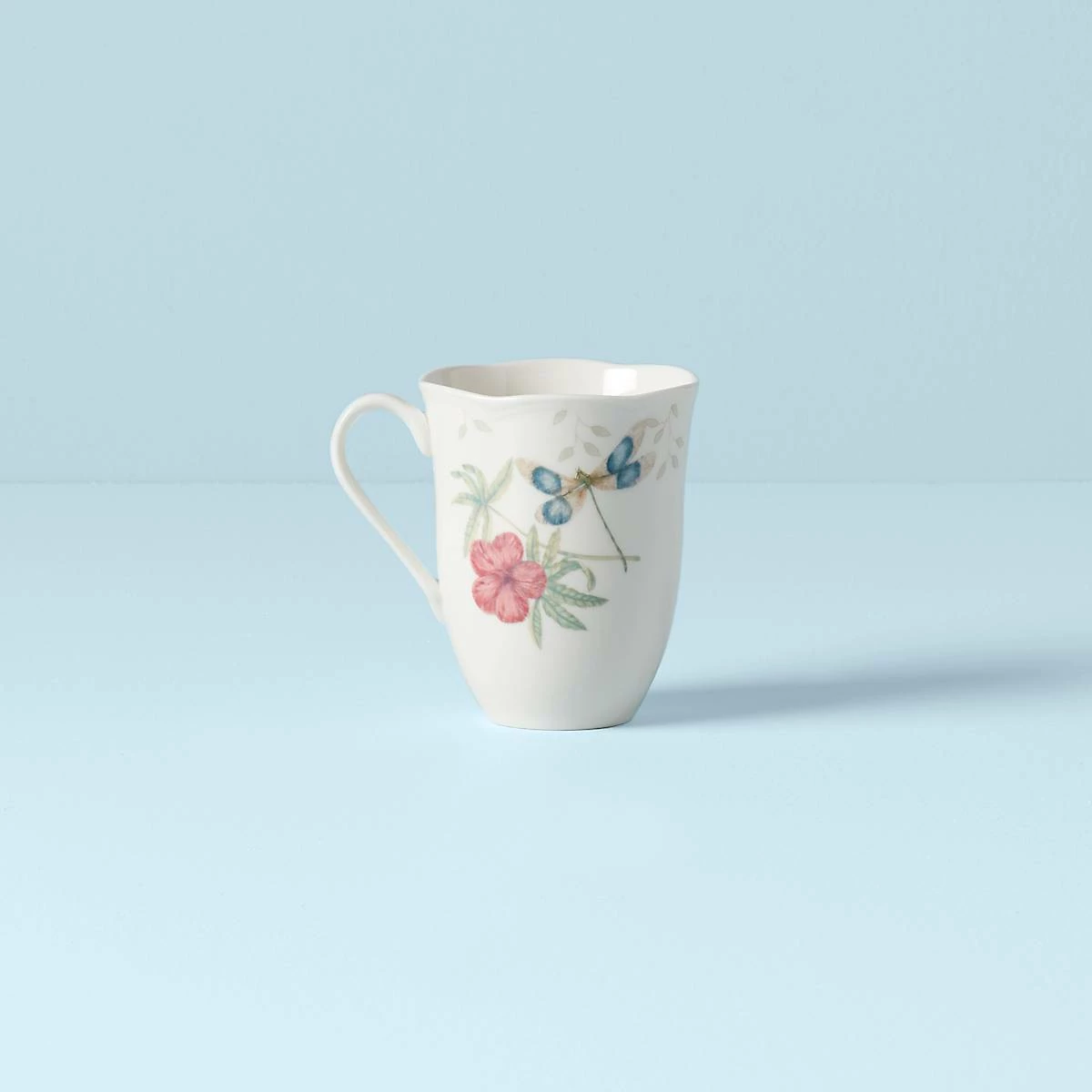 A dragonfly flutters above a welcoming flower on the charming Butterfly Meadow Dragonfly Mug. This durable white ceramic porcelain mug features a scalloped rim, and is microwave and dishwasher-safe. Mix and match the mug with other Butterfly Meadow mugs, saucers, and dinnerware.