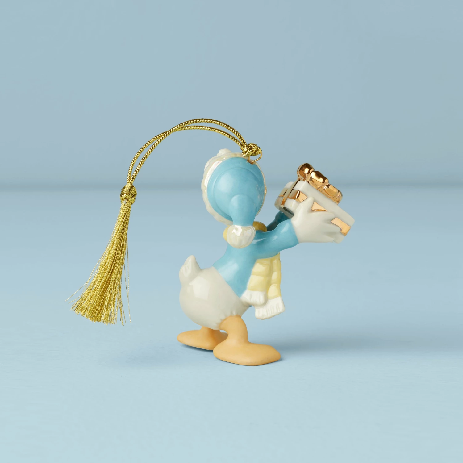 Donald is dressed in his wintery best, a pastel blue sweater and an arctic white scarf. He comes bearing a gift too! With gold accents that would make the perfect addition to your tree.