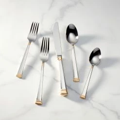 This five-piece place setting, crafted of 18/10 stainless steel, includes raised bands of 24-karat gold along the handles, for a brilliant touch of texture and shimmer. With its smooth, modern lines, the set looks splendid with contemporary dinnerware, and includes a dinner fork, dinner knife, salad fork, tablespoon, and teaspoon.