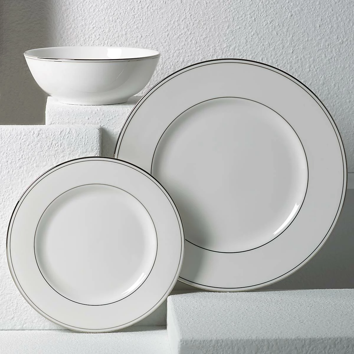 Crafted in durable porcelain and featuring shimmering platinum accents along the rim, this three-piece place setting collection includes a dinner plate, salad plate, and all-purpose bowl. This item is dishwasher-safe, for added convenience.