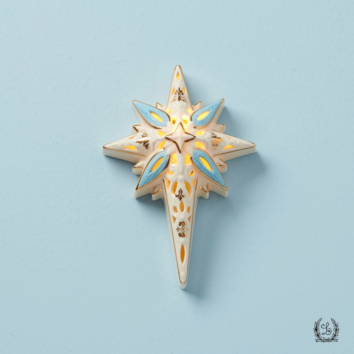 The First Blessing Nativity Lighted Star Figurine features LED lights that grant it a stylish modern edge, and it works as an ornament and as an addition to any Nativity set. This item comes with batteries included.