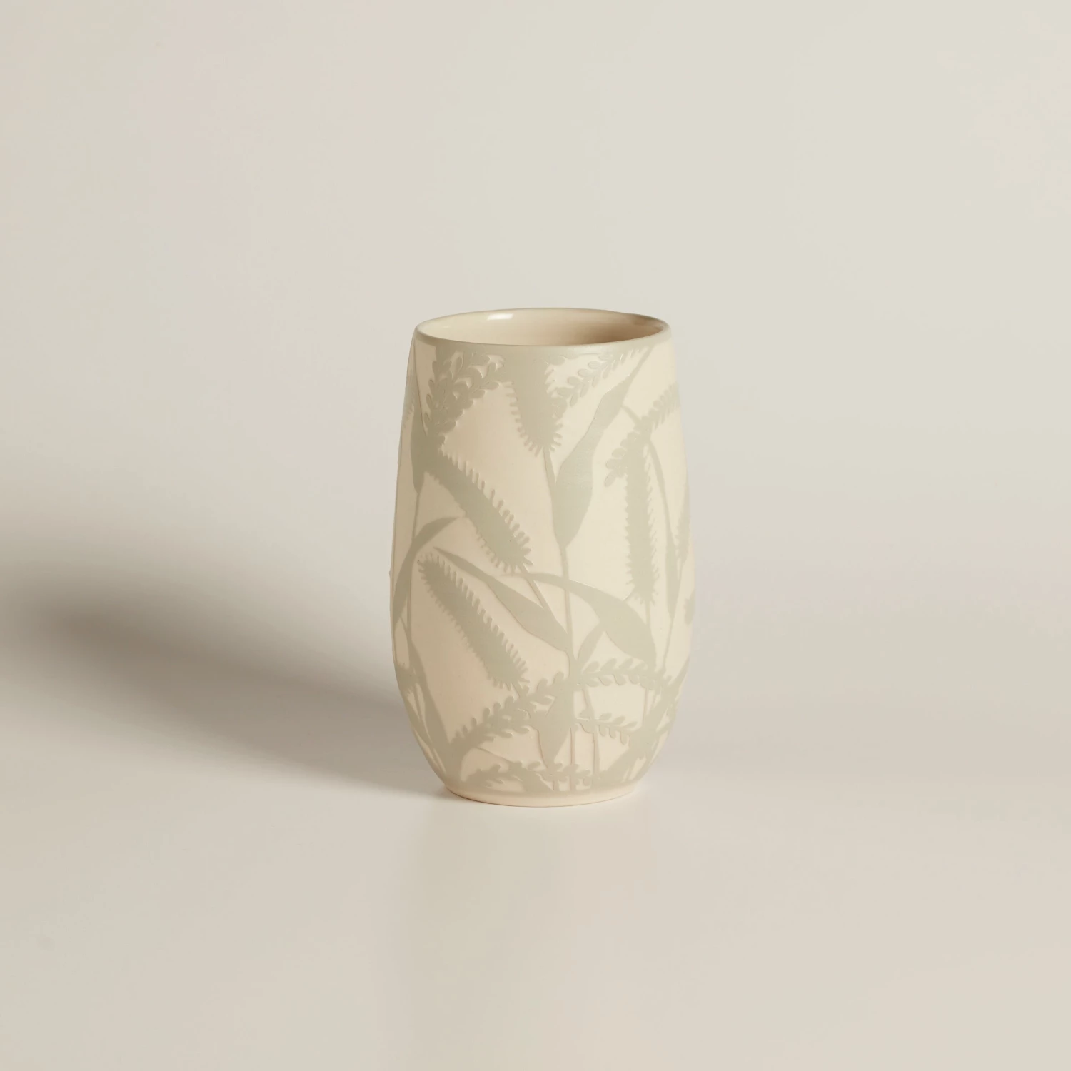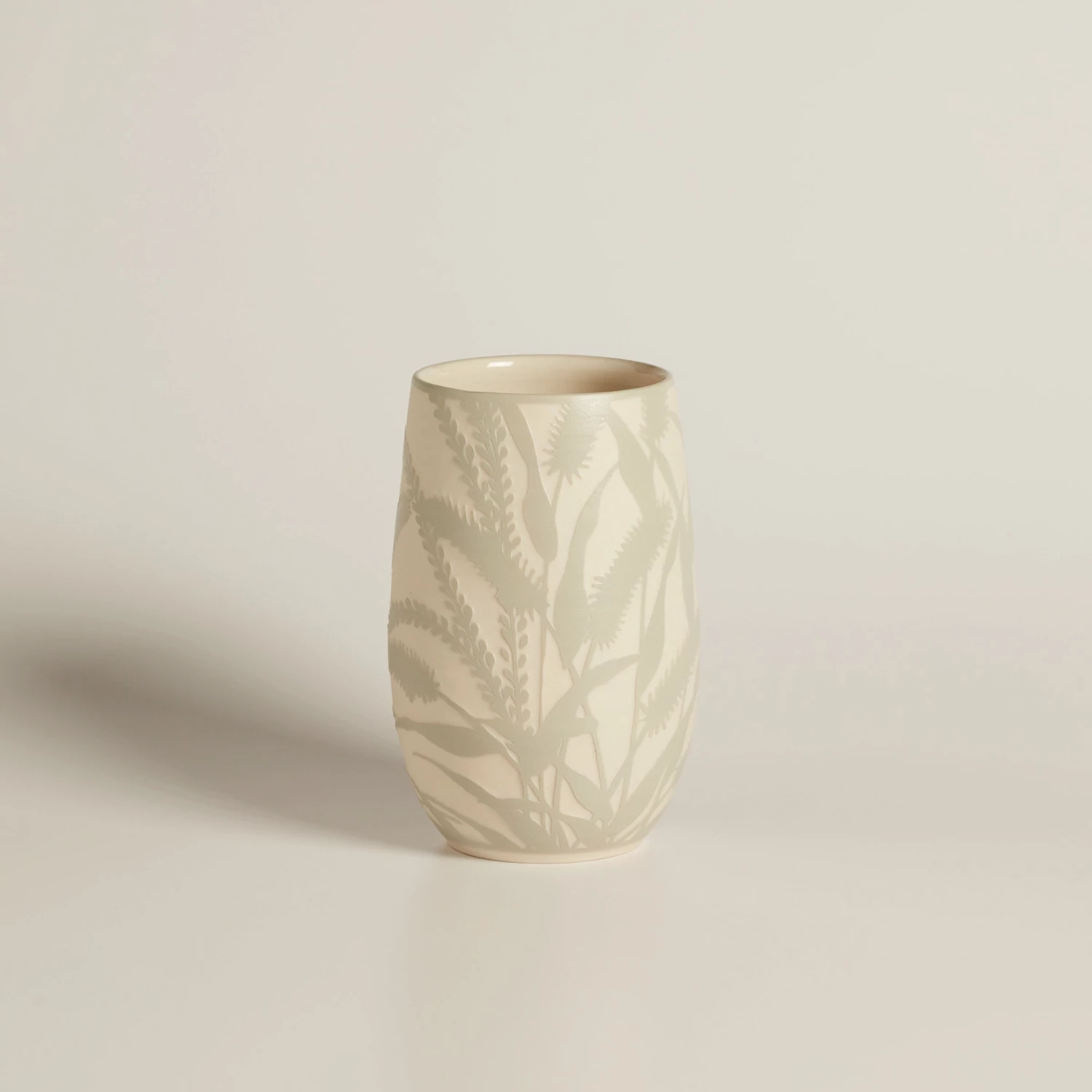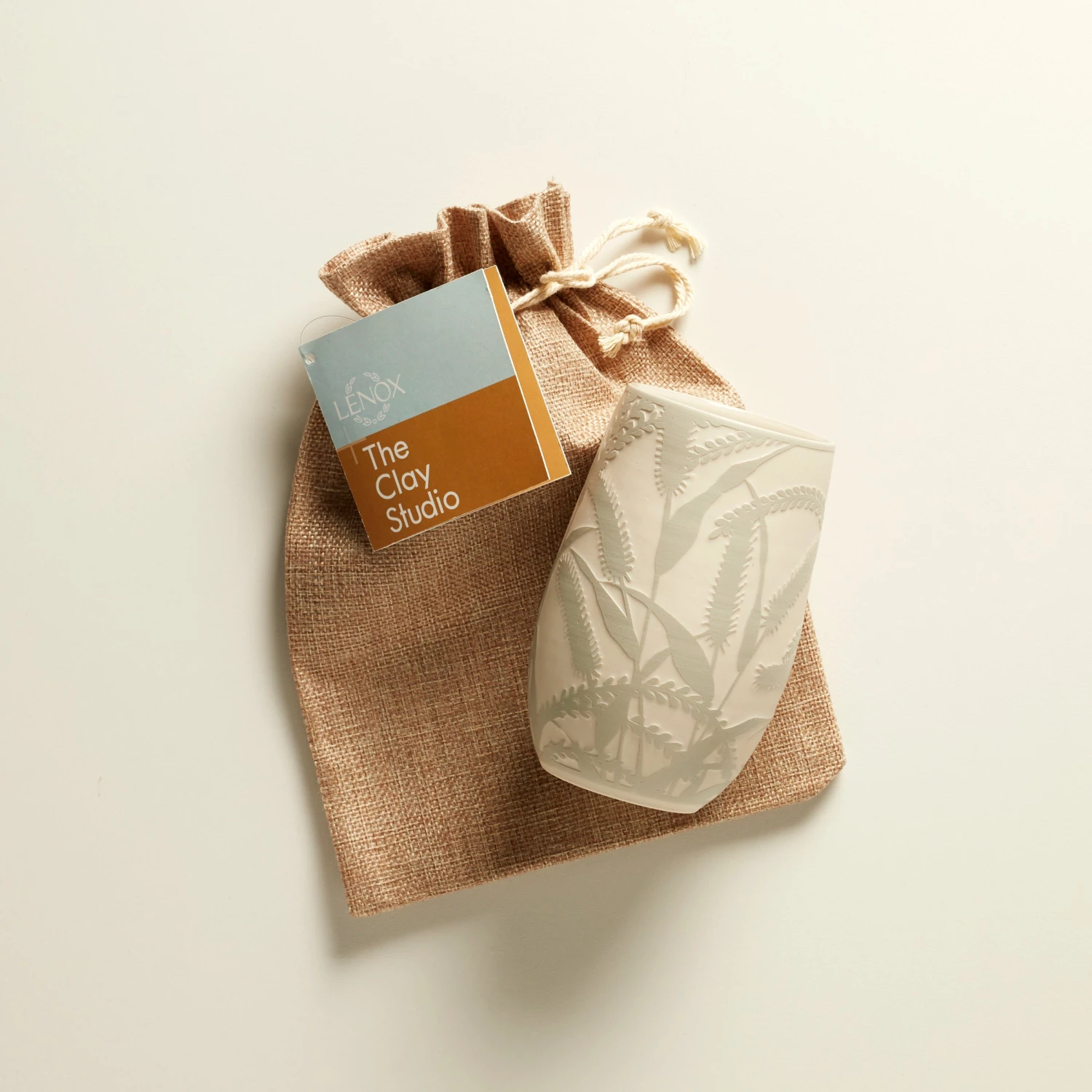 Etched with botanicals in a Japanese artwork-inspired design, Katherine Hackl’s Foxtails and Rice is an individually crafted testament to nature’s variety and spontaneity. Early in her ceramics engagement, Katherine Hackl apprenticed with Byron Temple and Suehiro Oshio, masters who taught her the skills, values, and rhythm of a working studio life. A later apprenticeship with Moravian Pottery and Tile Works brought a focus on narrative imagery. Her work celebrates the individual beauty of nature. “The aesthetics of Japanese artwork have been an incredible influence. It’s one of the wells that I go back to over and over again.” –Katherine Hackl