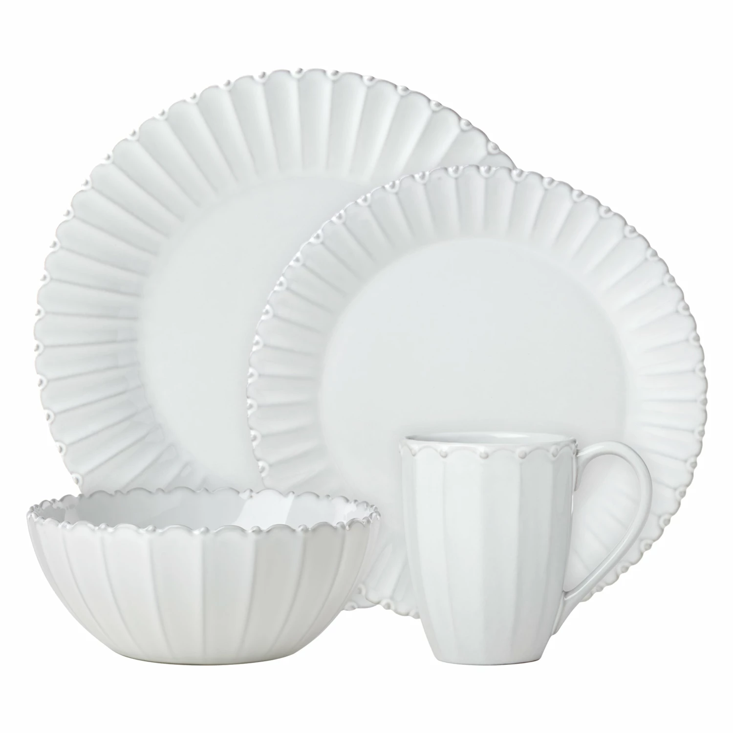 The French Carved Bead collection is charmingly chic. This 4-piece place setting brings elegance to everyday meals with decorative elements of raised beads and whitewashed glaze. Crafted of durable stoneware, this dinnerware set is dishwasher and microwave-safe for added convenience.
