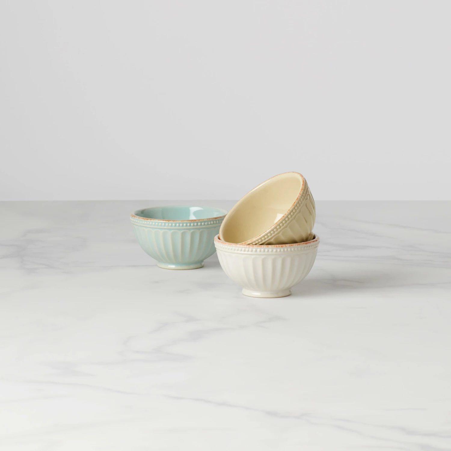This set of three mini durable ceramic stoneware bowls features rustic grooves along the sides, and a pattern of tea-stained beads on the outside border, for a quaint touch. The set includes white, pistachio, and ice blue. This item is microwave and dishwasher-safe, for added convenience.