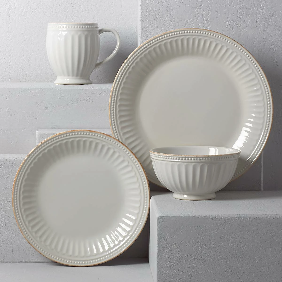 Including a gentle curved border accented with hand-applied tea stains, this four-piece place setting, crafted of durable white ceramic stoneware, gleams with beads and thick grooves that add texture. This item is microwave and dishwasher-safe, for added convenience.