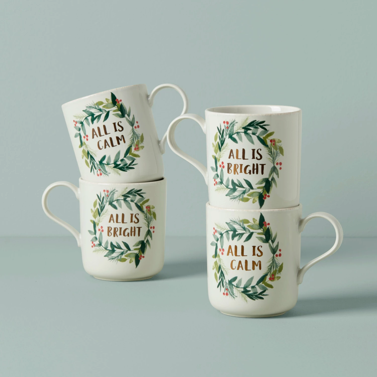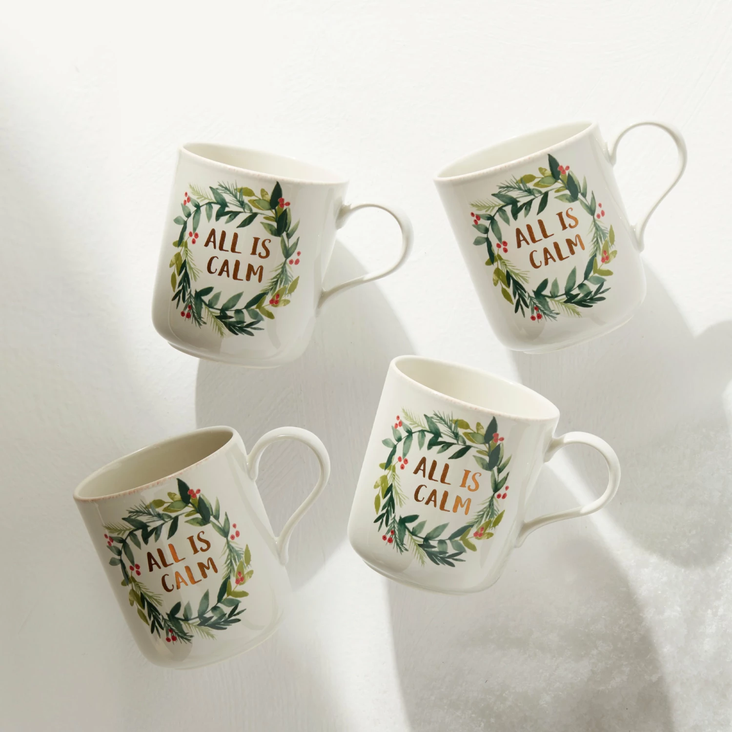 A festive fresh spin on the French Perle favorites. These mugs feature a wreath of artistic holiday holly with leaves, branches, and berries in a handpainted style around the words “All Is Calm”. Crafted with smooth scallops on a snowy white base for a creative winter feel.