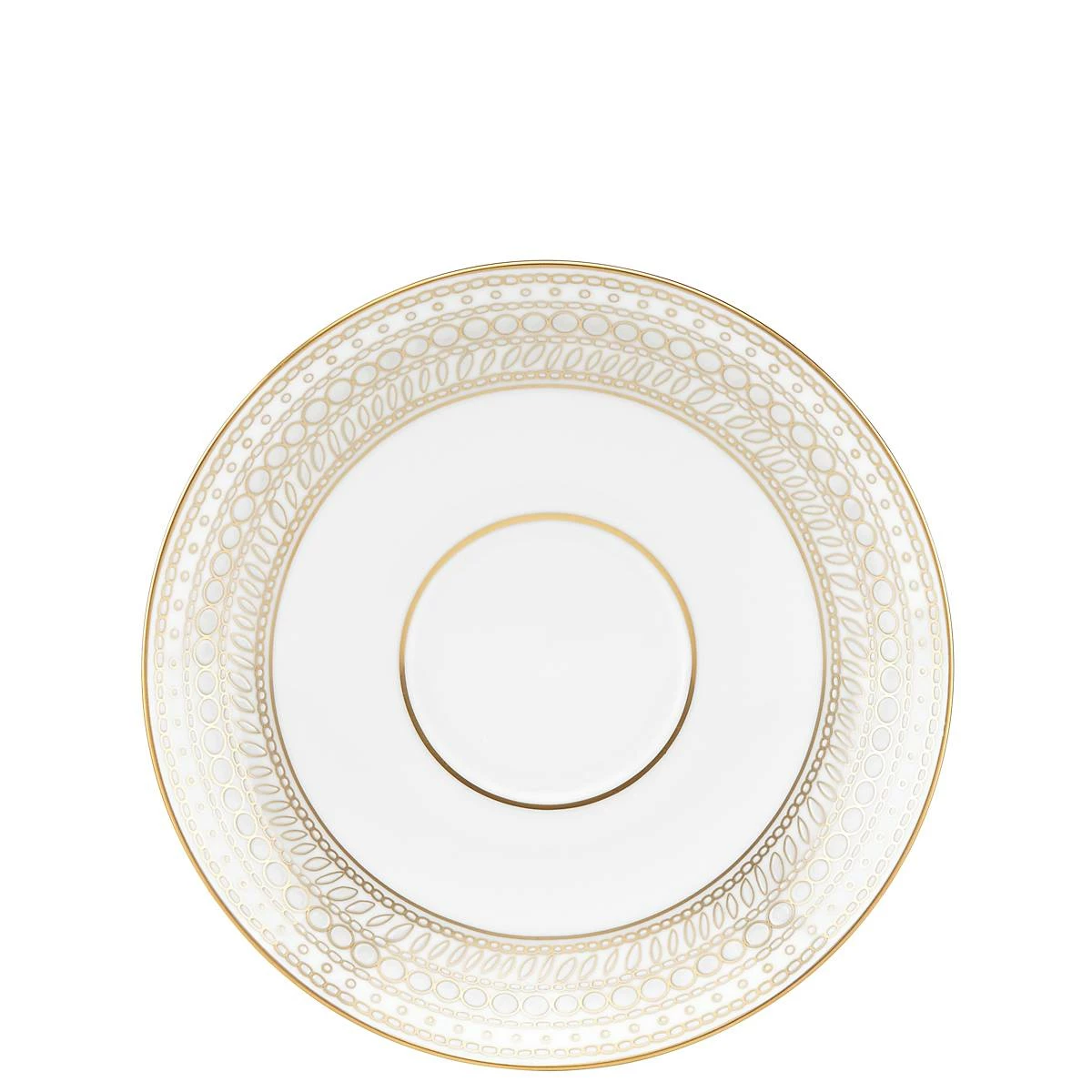 Reflective of the elaborate hand-stitched beadwork of a couture gown, the Marchesa Gilded Pearl Saucer brings high fashion to a cup of tea. Shimmering 24-karat gold accents compliment raised enamel elements that have been applied by hand to this saucer. Made from durable bone china and dishwasher-safe.