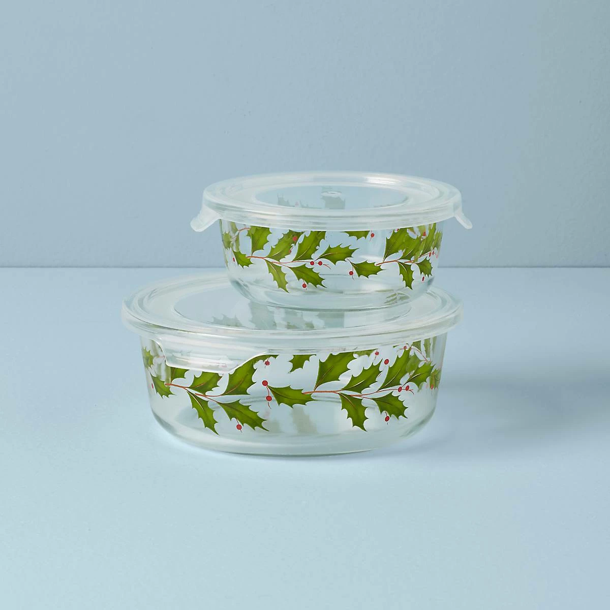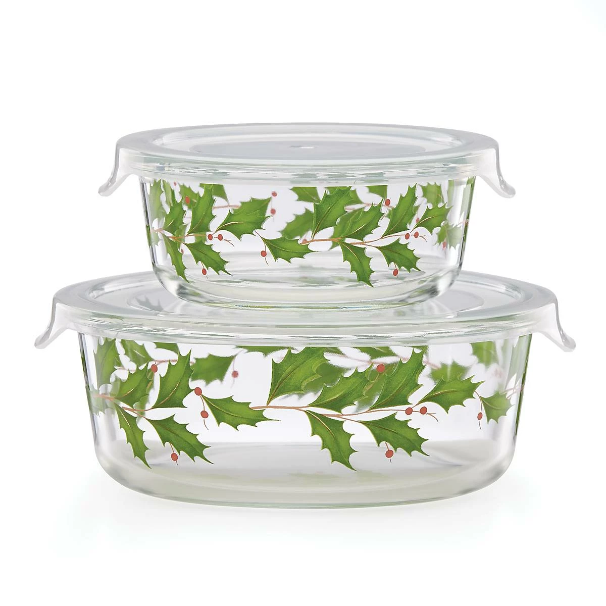 Send guests home with leftovers with this two-piece set of glass bowls in a charming holly leaf pattern.