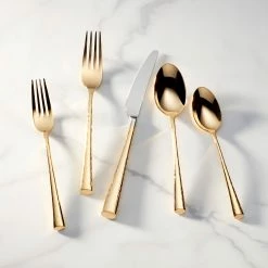 This elegant and intriguing Imperial Caviar flatware setting features a subtle hammered texture that will impress and enthrall guests. This glowing golden place setting includes a salad fork, dinner fork, soup spoon, dessert spoon, and butter knife.