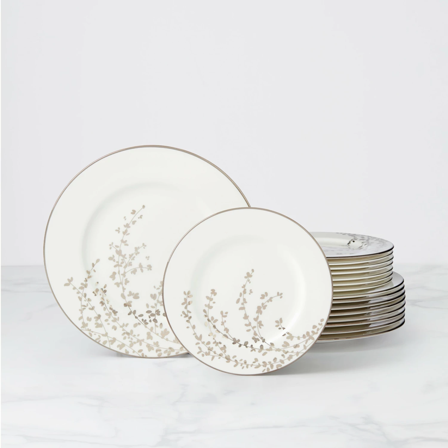An instant classic from Kate Spade New York, Gardner Street Platinum dinnerware is the definition of contemporary elegance. Stems of platinum foliage flourish on fine white bone china, creating a stylized two-tone floral motif to freshen up your formal table.