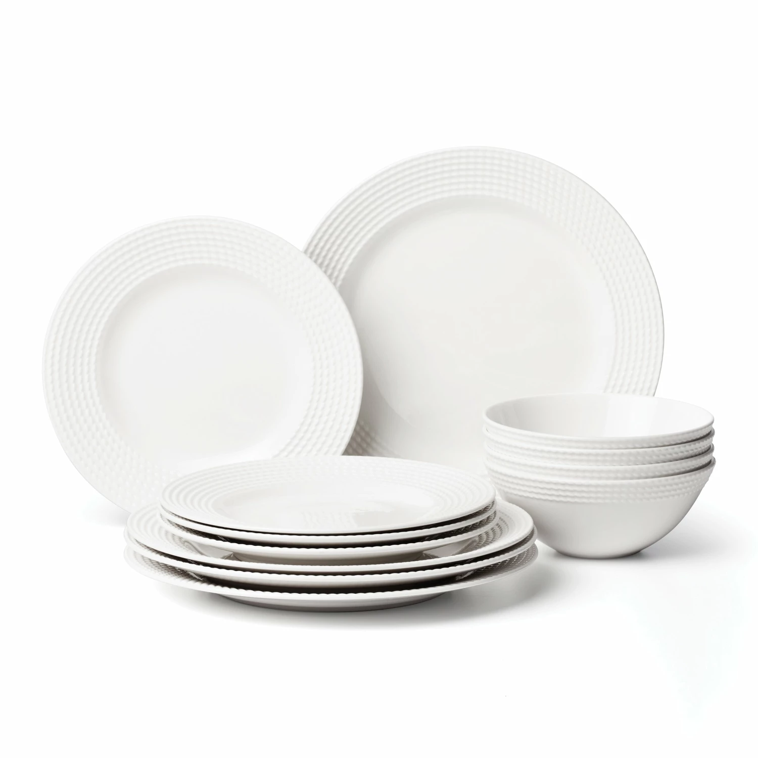 Service for everyone! Grab this functional, yet fun collection of dinnerware to embrace your hosting superpowers. With a clean porcelain base and textured edges, this set includes 38 pieces, so you’ll have room for all.