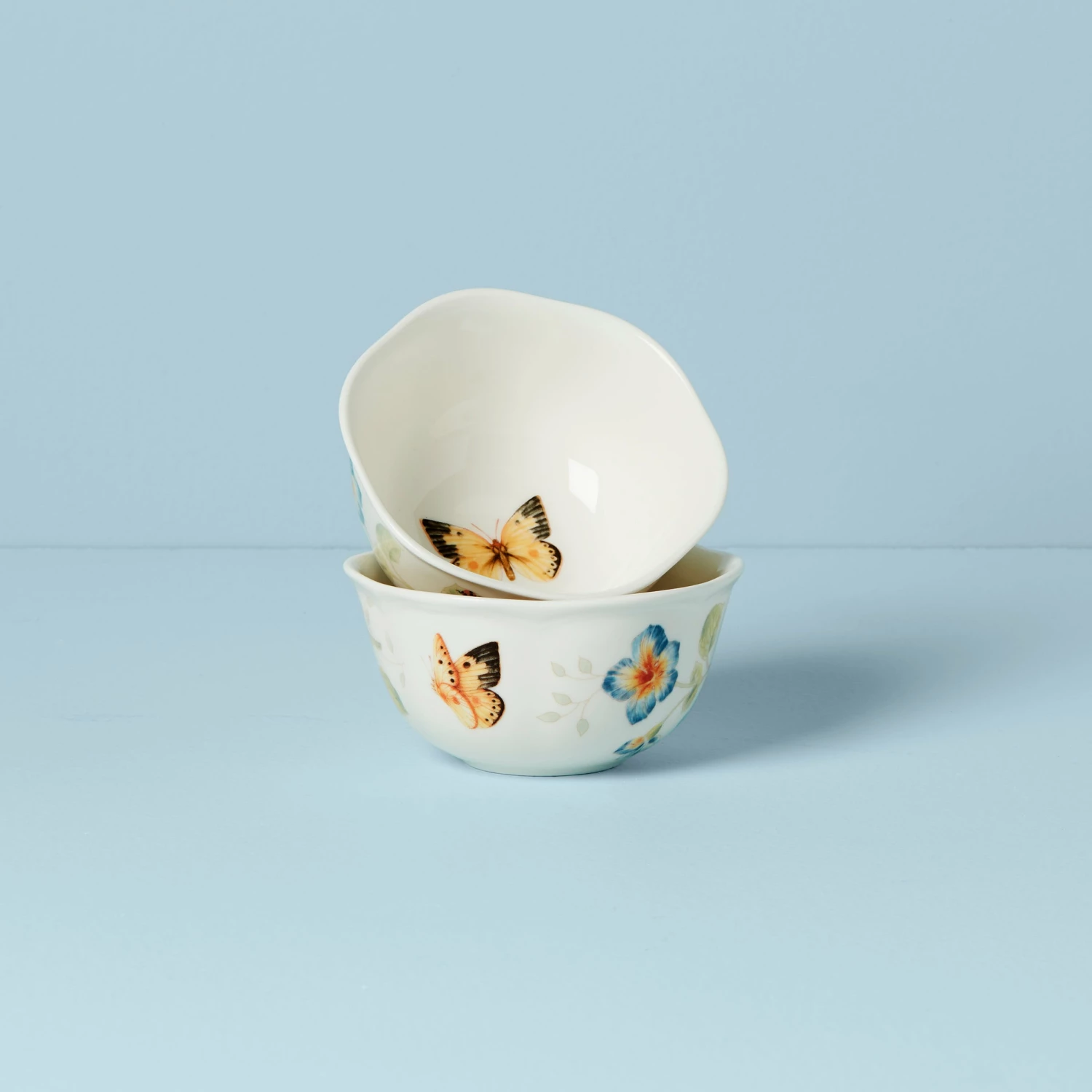 The classic Butterfly Meadow design decorates and shapes this durable, 2-piece porcelain dessert bowl set with a gently scalloped rim and lively garden illustrations. These dishwasher and microwave-safe bowls make a charming addition to any table setting.