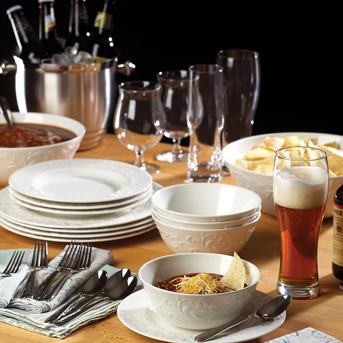 The simply elegant Opal Innocence Carved 4-piece Set features a flowing scroll motif in a raised relief on each pristine white rim. This casual and durable ceramic porcelain set is microwave and dishwasher-safe, for added convenience.