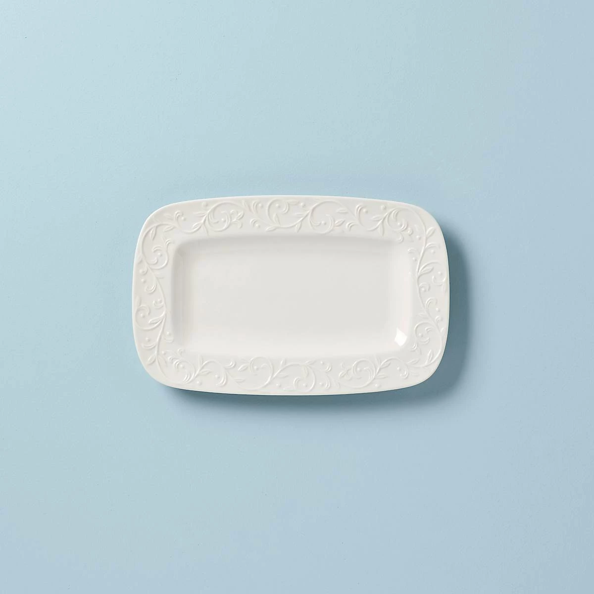 The simply elegant Opal Innocence Carved Hors D’oeuvres Tray features intuitive wide rims for easy handling, and features a flowing scroll motif in a raised relief on its pristine white rim. This casual and durable ceramic porcelain tray is also microwave and dishwasher-friendly, for added convenience.