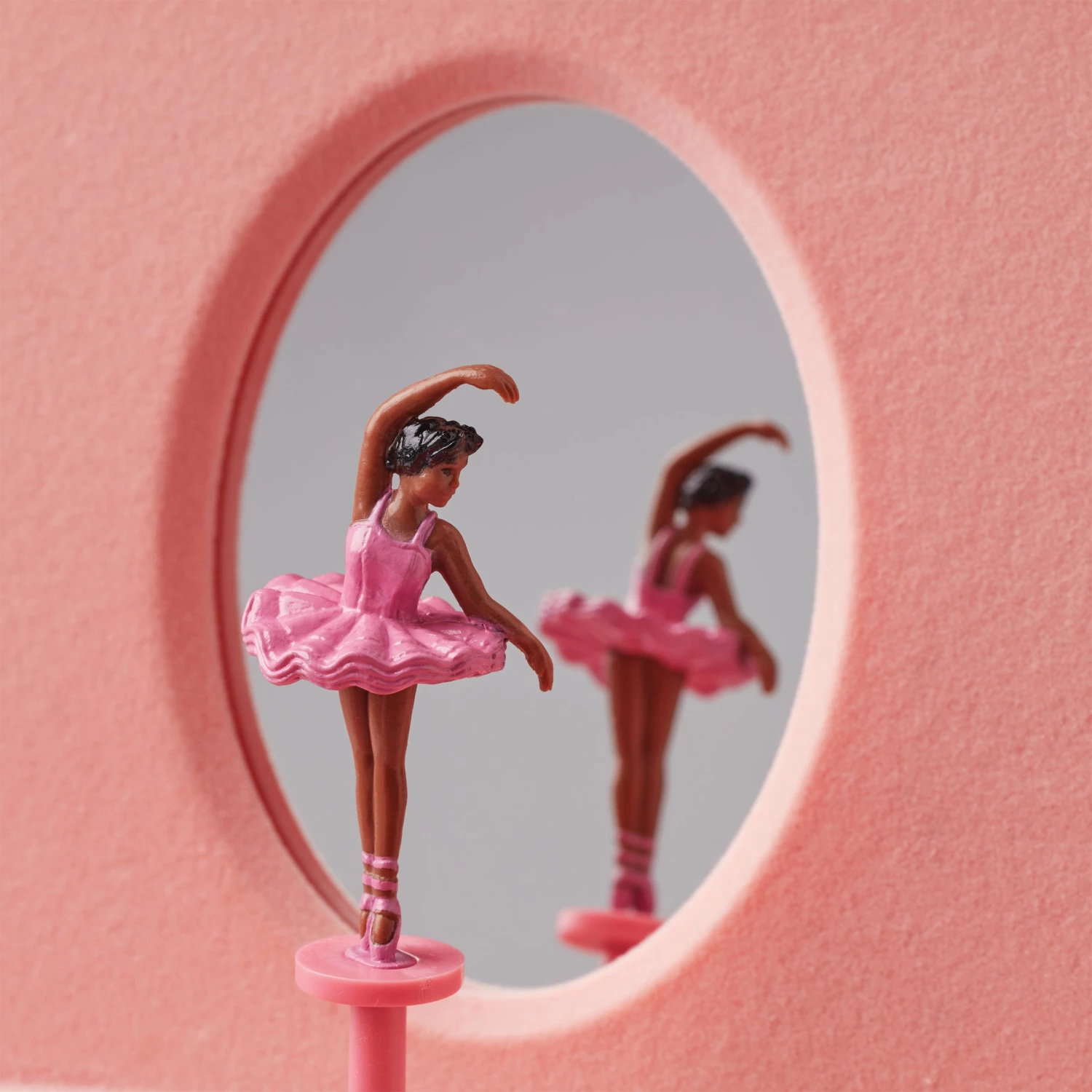 With a graceful African American ballerina that spins in front of a mirror, the Childhood Memories jewelry box is perfect for the aspiring dancer. Its charming outer shell opens to a soft pink felt interior with several compartments for storing prized jewelry and trinkets. Plays “FΓΌr Elise.”