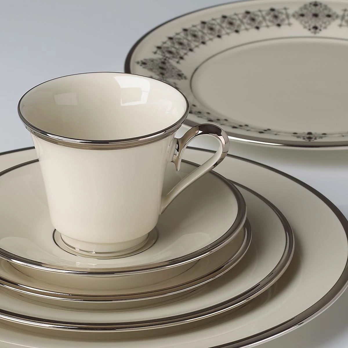 The Solitaire 5-Piece Place Setting features thick, shimmering platinum trim on durable porcelain. This sophisticated dinnerware set bears a rich yet simple design perfect for combining with similar sets. This item is dishwasher-safe, for added convenience.