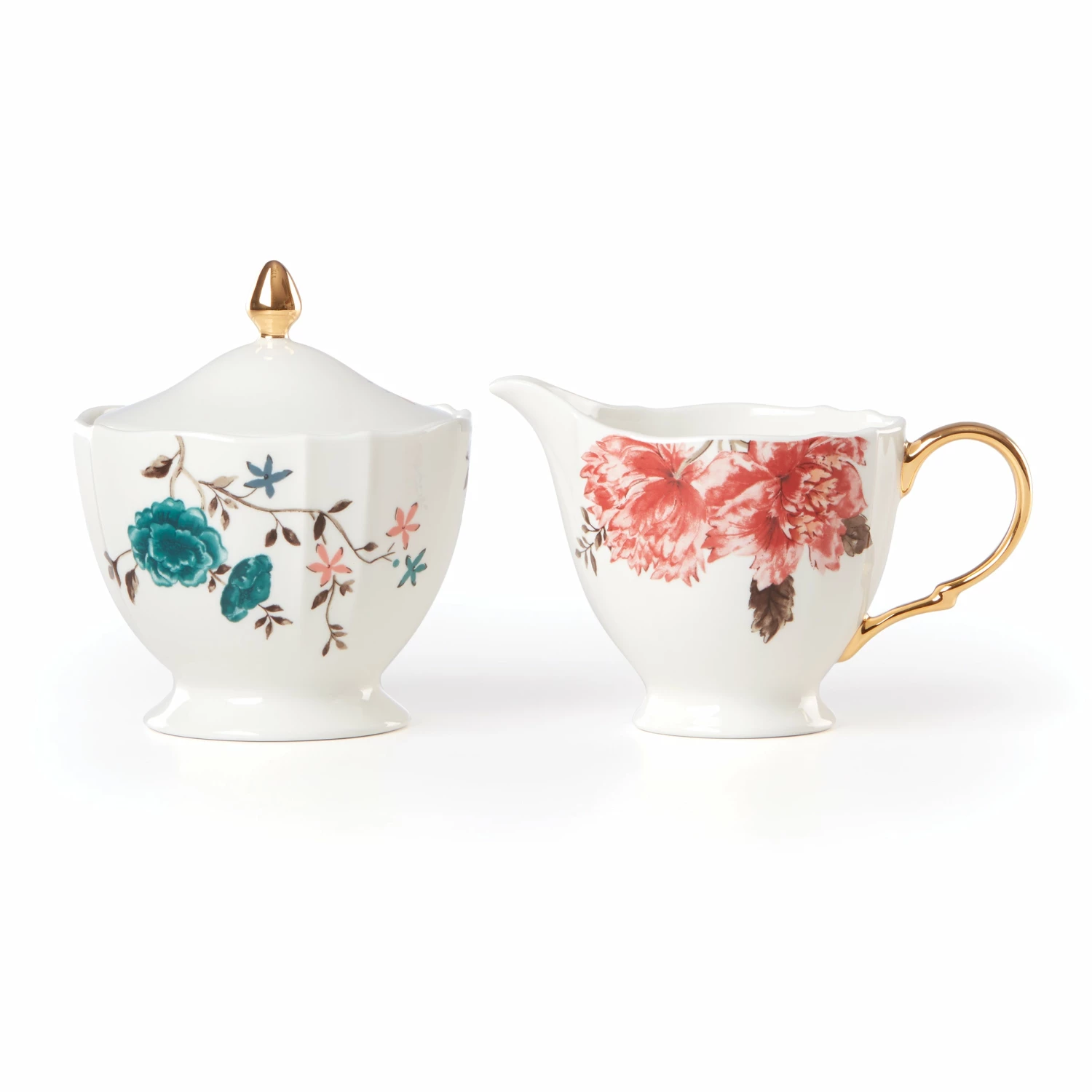 Bring the beauty and bright colors of a lush English garden to your home with the Sprig & Vine collection. This sugar bowl and creamer set features botanical illustrations inspired by vintage textiles. The golden handle on the creamer is the perfect touch to give this set a gleaming finish.